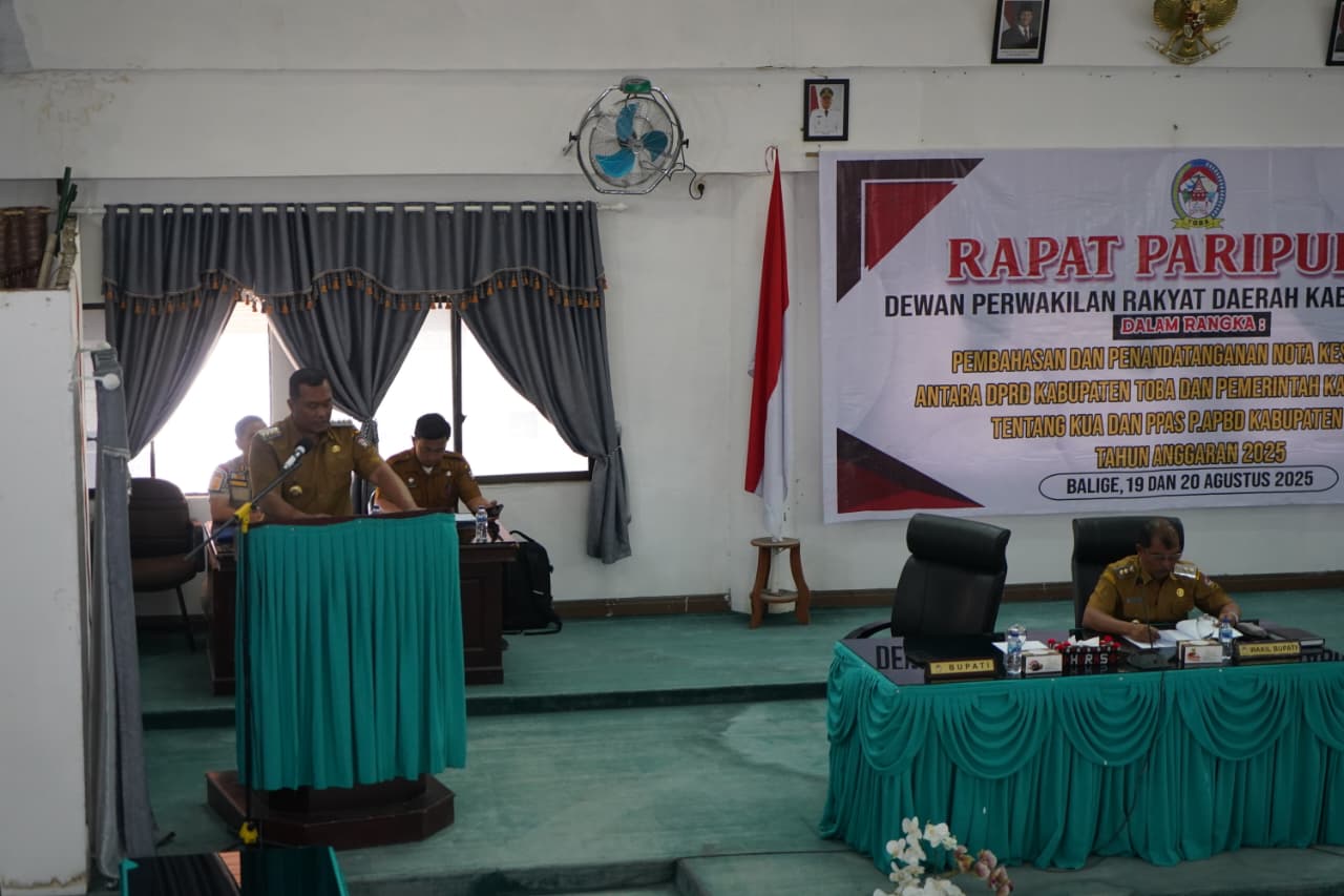 Klikbangsa.com (Toba) – Bupati Toba Effendi Sintong P. Napitupulu menyampaikan Nota Pengantar Rancangan Perubahan Kebijakan Umum Anggaran (P.KUA) dan Rancangan Perubahan Prioritas dan Plafon Anggaran Sementara (P.PPAS) Anggaran Pendapatan dan Belanja Daerah (APBD) Kabupaten Toba Tahun Anggaran 2025 kepada DPRD Toba pada rapat paripurna yang digelar di gedung DPRD Toba pada Selasa (19/8/2025).