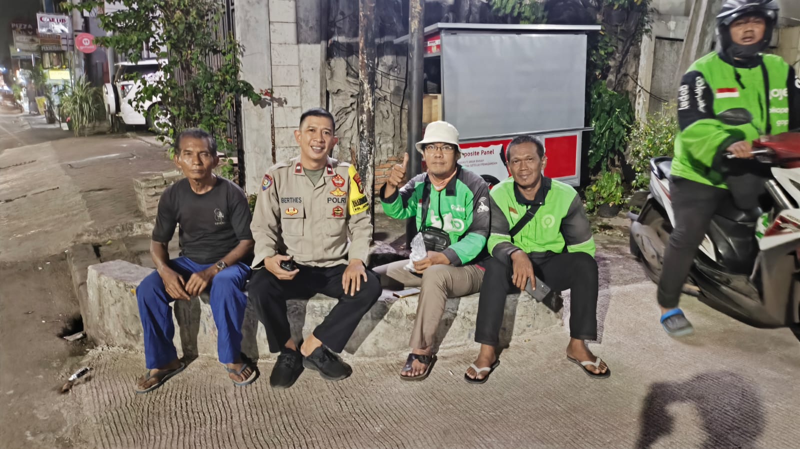 Dalam kegiatan tersebut, Bhabinkamtibmas bertemu dengan Bapak Sugiyono, seorang petugas keamanan (security), serta beberapa rekan pengemudi Gojek yang sedang menunggu pesanan GoFood dan penumpang. AIPDA Lamberthes menyampaikan himbauan agar mereka saling berkomunikasi dan bersama-sama menjaga lingkungan agar tetap aman dan nyaman.