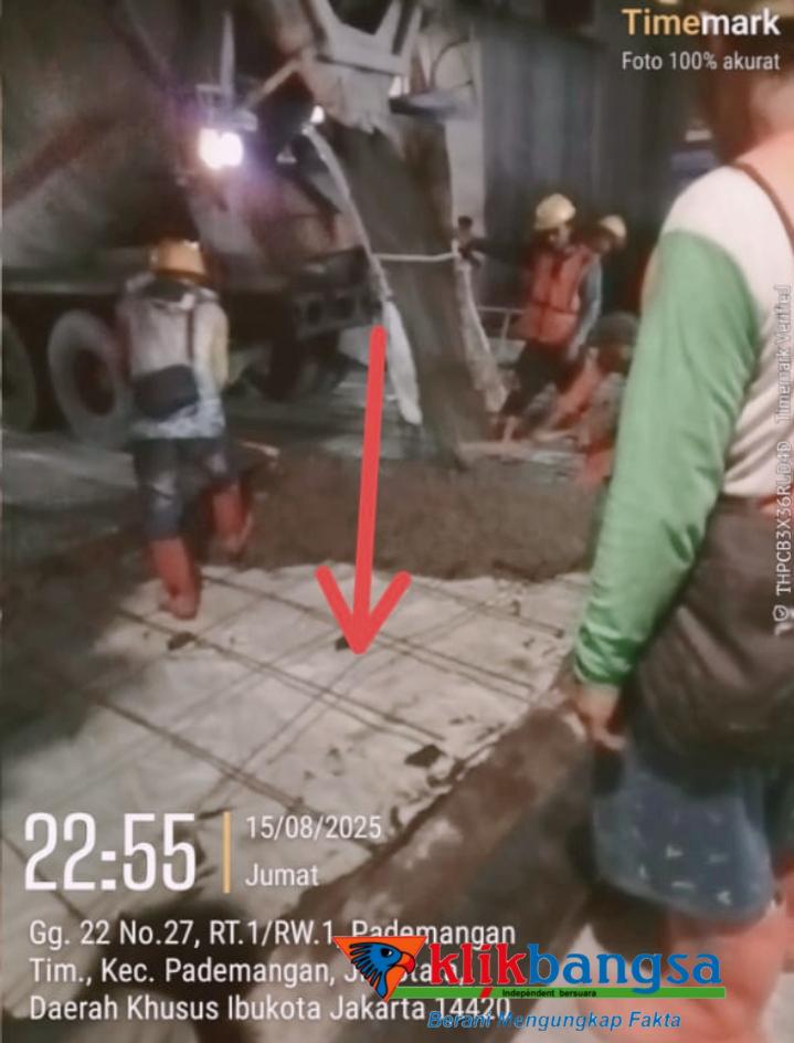 Jarak pembesian diduga tidak sesuai dengan spesifikasi teknis maupun gambar dan termasuk ketebalan cor dilokasi Gang 22 Rt 01/Rw 01 Pademangan Timur, Kec.Pademangan, Jakarta Utara dan disaksikan sejumlah warga setempat.