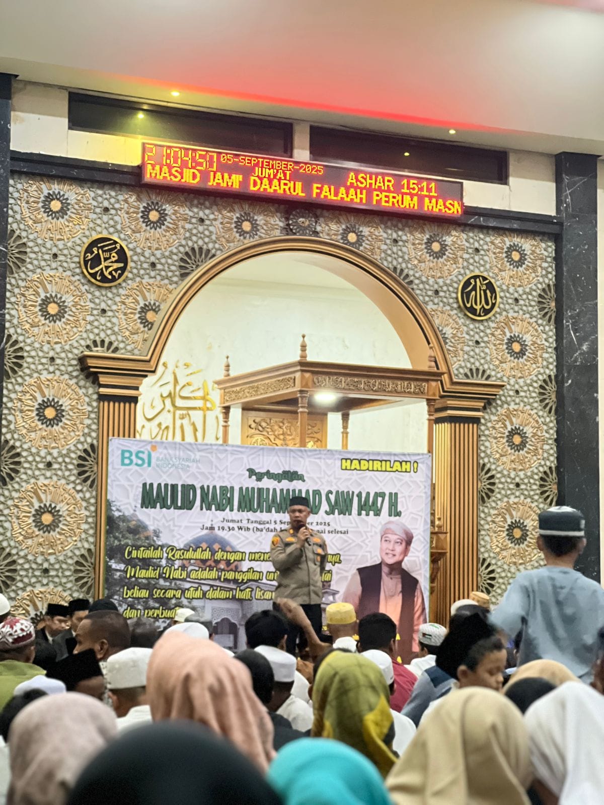 Klikbangsa.com-Bekasi Kota. Dalam rangka menjaga dan memelihara situasi kamtibmas yang kondusif, Kapolsek Bekasi Barat, AKP Dr. H. Wahyudi, S.H., M.H., menghadiri kegiatan peringatan Maulid Nabi Muhammad SAW yang diselenggarakan di Masjid Daarul Falaah, Perumahan Mas Naga RW.012, Kelurahan Bintara Jaya, Kecamatan Bekasi Barat, Kota Bekasi, pada Jumat, 5 September 2025.
