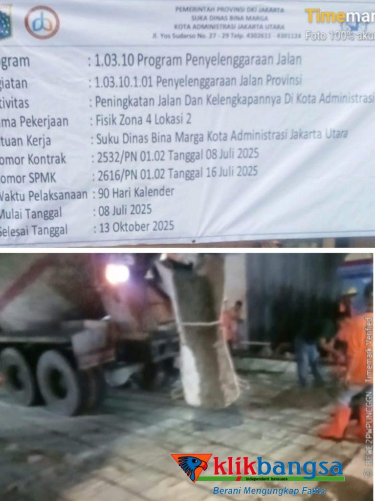 Pantauan tim awak media dilapangan, khususnya peningkatan jalan dan kelengkapannya di Kota Administrasi Jakarta Utara (Fisik Zona 4, Lokasi 2). Satuan pekerjaan Sudin Bina Marga Jakarta Utara, No.Kontrak:2532/PN.01.02/Tanggal 8 Juli 2025.