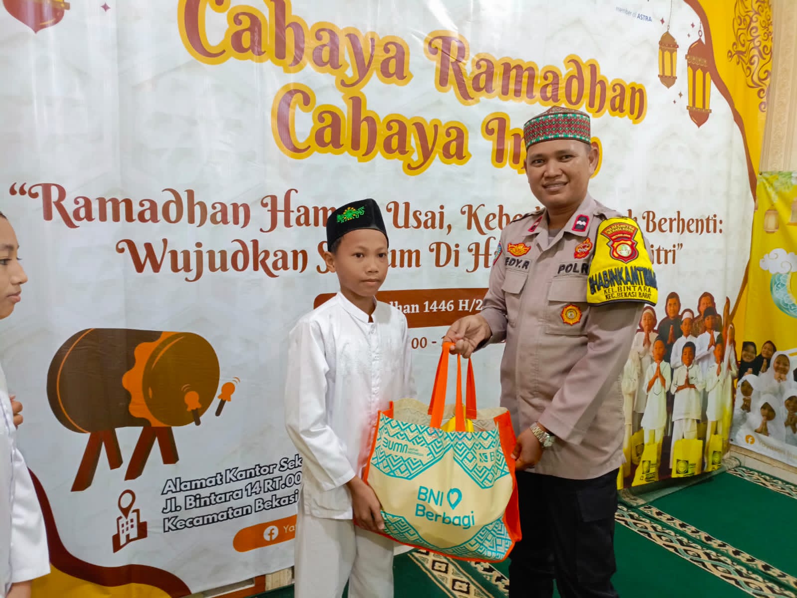 Klikbangsa.com (Bekasi Barat) – Polsek Bekasi Barat melalui Bhabinkamtibmas Bintara Aipda Tedy Rivaldi bersama Yayasan Insan Bintara memberikan santunan kepada anak yatim di Aula Yayasan Insan Jalan Bintara XIV RT.05 RW.09 Kelurahan Bintara Kecamatan Bekasi Barat Kota Bekasi.Minggu(23/3-2025).