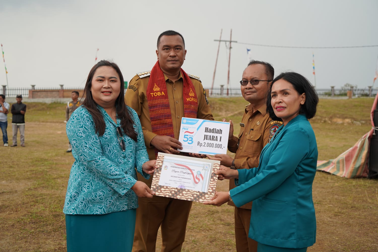 Pada kesempatan itu Pemerintah Kabupaten Toba juga menyerahkan seperangkat alat kebersihan kepada seluruh camat se-Kabupaten Toba. Pemkab Toba juga menyerahkan hadiah kepada para juara pada lomba yang digelar oleh PKK. (MC Toba)