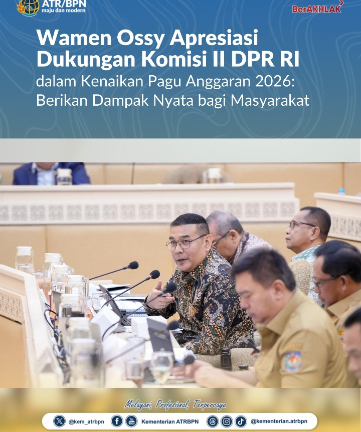Klikbangsa.com-Jakarta. Wakil Menteri Agraria dan Tata Ruang/Wakil Kepala Badan Pertanahan Nasional (Wamen ATR/Waka BPN), Ossy Dermawan, menyampaikan apresiasi atas dukungan Komisi II Dewan Perwakilan Rakyat Republik Indonesia (DPR RI) dalam hal kenaikan pagu anggaran Kementerian ATR/BPN tahun 2026. Apresiasi itu ia sampaikan dalam Rapat Dengar Pendapat (RDP) bersama Komisi II DPR RI, di Gedung Nusantara, Jakarta, Senin (15/09/2025).