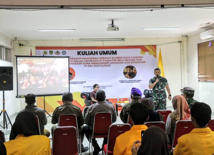 Demikian tema kuliah umum yang disampaikan oleh Dandim 0624/Kab Bandung Letkol Inf Hamzah Budi Susanto SE. M.I.P dihadapan 100 mahasiswa/i UNIBBA serta undangan di Gedungnya RH Lily Sumantri, kampus UNIBBA Baleendah Kab Bandung, Senin (27/02). Menurut Dandim berkenaan dengan bela negara dan Wasbang merupakan tugas Kodim untuk menularkan kepada adik-adik mahasiswa agar mempunyai rasa bangga terhadap Indonesia sebagai negara besar di dunia dengan banyak potensi yang harus digali.