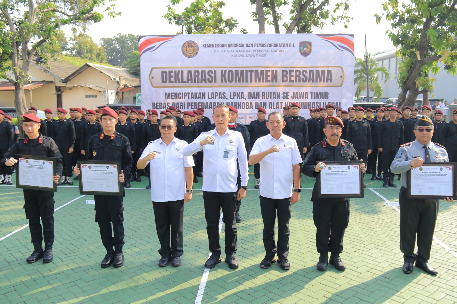“Ini bukan sekadar seremoni. Ini adalah komitmen moral, kelembagaan, dan operasional kami untuk menjadikan seluruh Lapas dan Rutan di Jawa Timur bersih dari narkoba dan HP ilegal,” tegasnya.