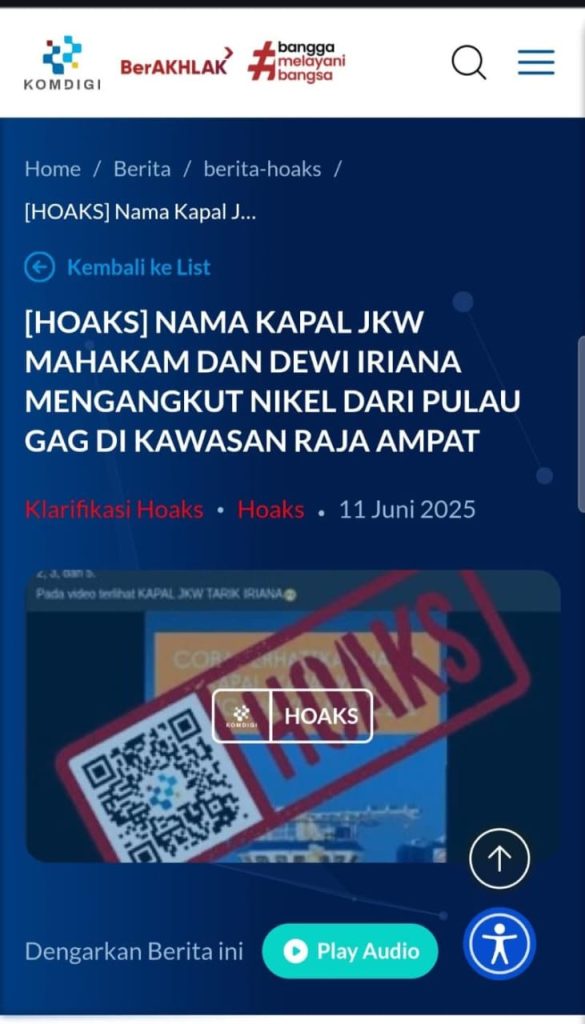 Kasus terbaru, kata Wiendarto, adalah hoaks mengenai kapal tunda JKW Mahakam dan tongkang Dewi Iriana, yang menuding adanya kepemilikan oleh mantan presiden. “Padahal faktanya, kapal itu milik perusahaan publik yang disewakan untuk mengangkut batu bara di Kalimantan dan tidak ada hubungan dengan mantan presiden seperti yang disebutkan dalam fitnah itu. Untungnya perusahaan cepat merespons dengan klarifikasi yang jernih di situs resminya, hingga Komdigi menandainya sebagai hoaks,” jelasnya.