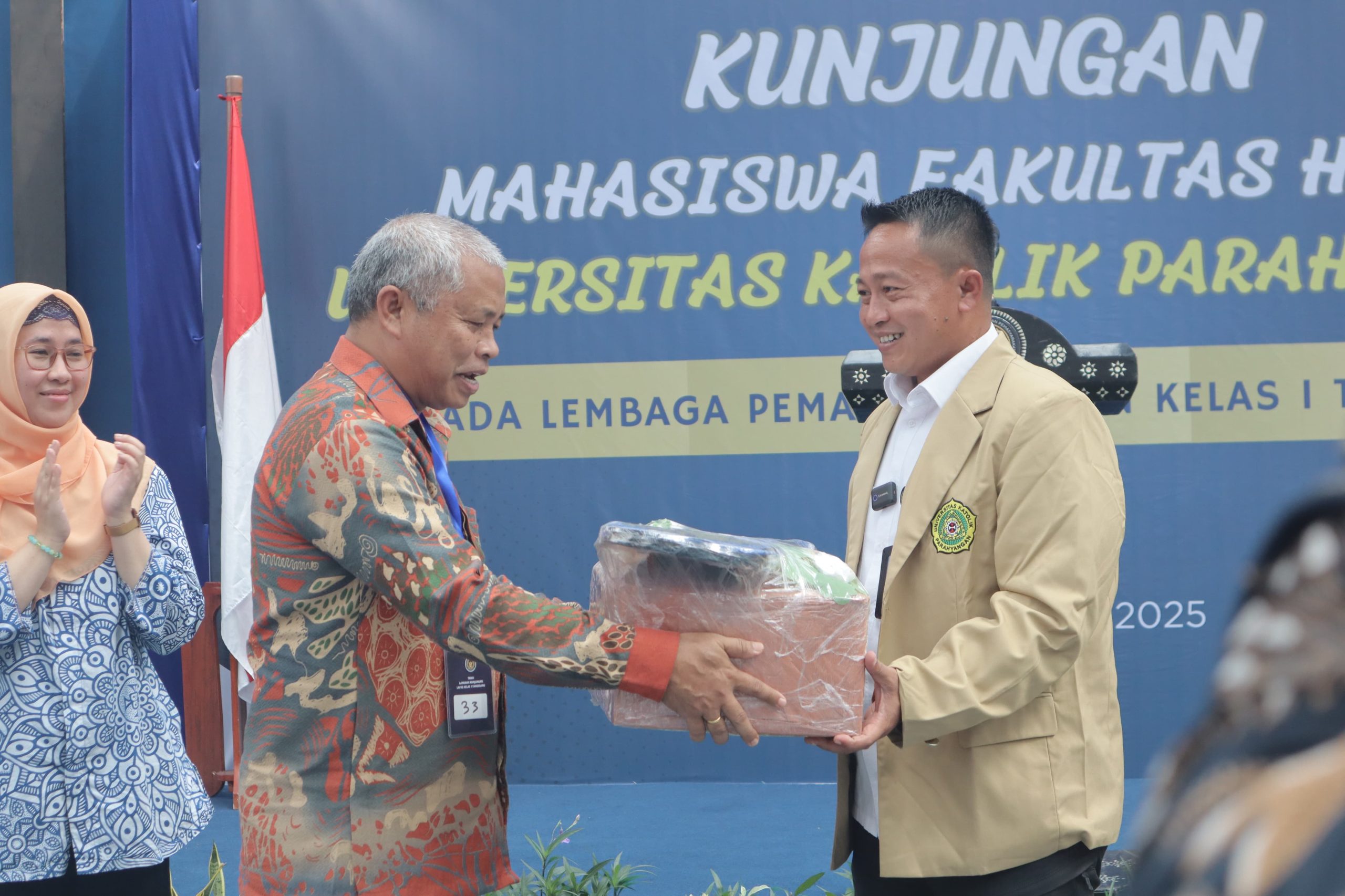 Kegiatan dilanjutkan dengan sambutan dari Bapak Djisman Samosir, S.H.,M.H. selaku Dosen koordinator mata kuliah Penologi dan Pemasyarakatan, serta penyerahan cinderamata antara pihak UNPAR dan Lapas Kelas I Tangerang sebagai bentuk apresiasi dan simbol kerja sama kelembagaan dalam mendukung dunia pendidikan.