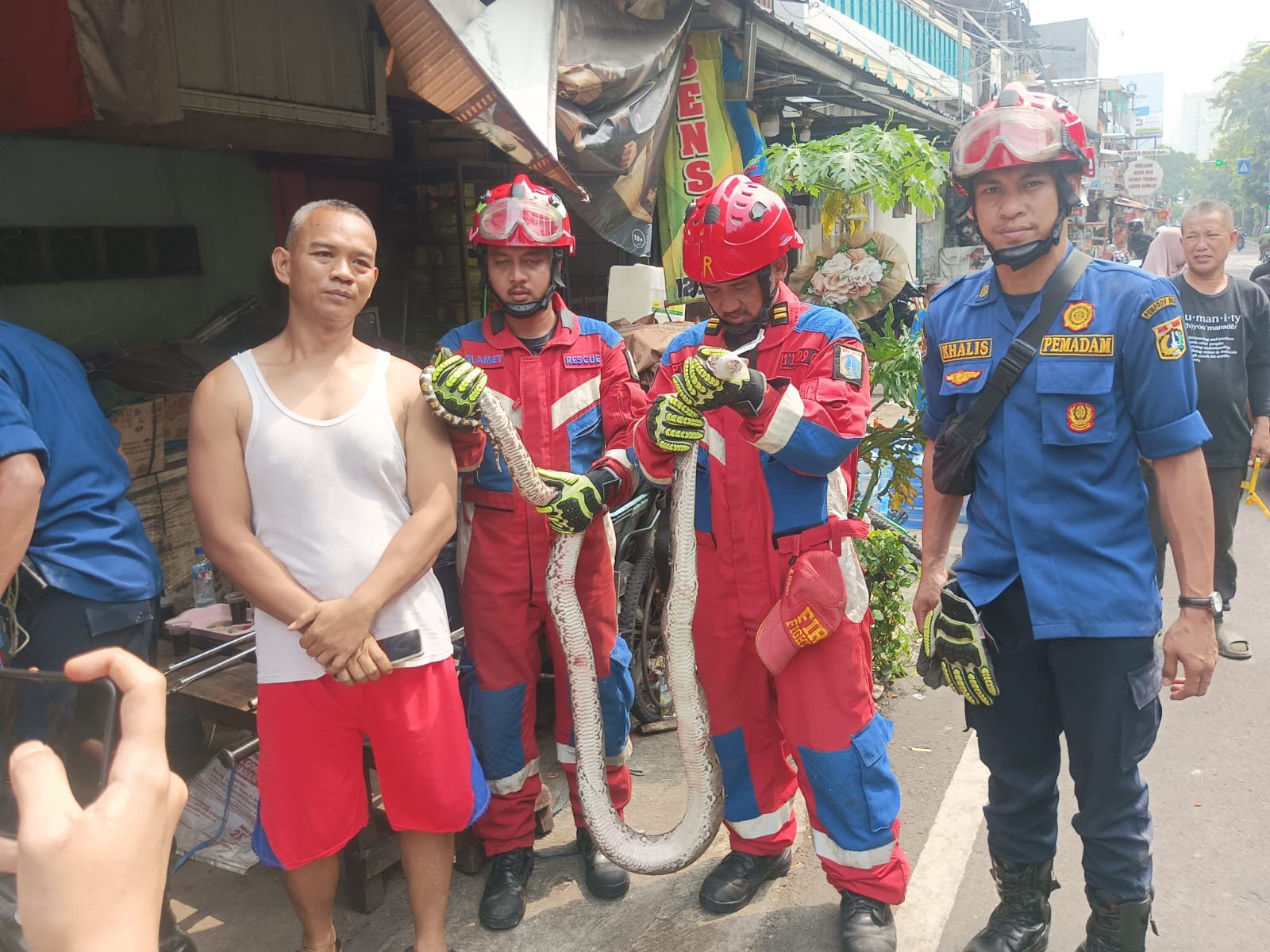 Dalam waktu hitungan menit akhirnya 5 petugas pemadam kebakaran. Suka Mulya jakarta pusat tiba di lokasi untuk menangkap ular tersebut.