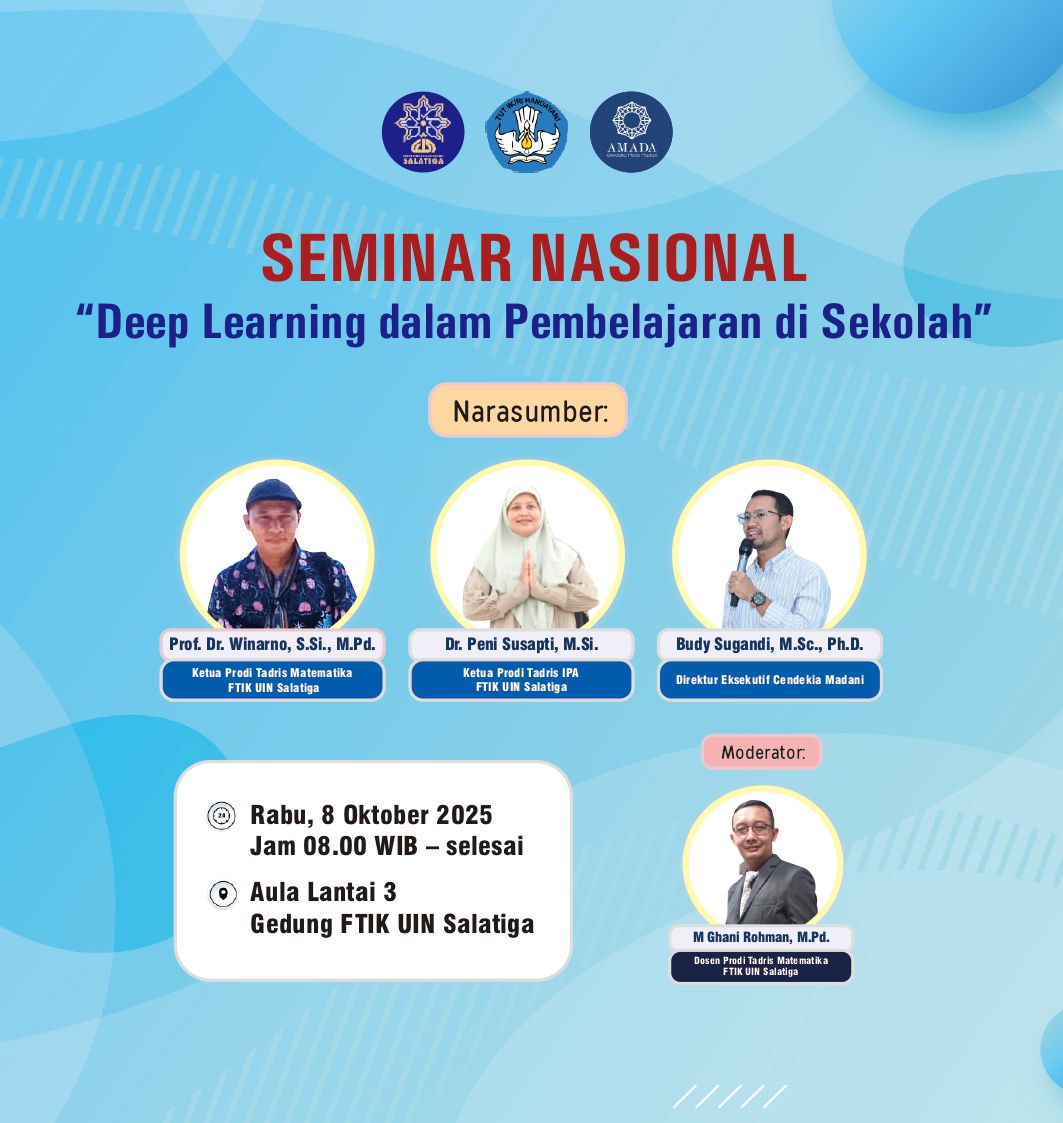 Seminar ini menghadirkan tiga narasumber utama, yaitu Prof. Winarno (Ketua Prodi Tadris Matematika FTIK UIN Salatiga), Dr. Peni Susapti (Ketua Prodi Tadris IPA FTIK UIN Salatiga), dan Budy Sugandi, Ph.D. (Direktur Eksekutif Cendekia Madani). Bertindak sebagai moderator adalah M. Ghani Rohman, M.Pd., Dosen Prodi Tadris Matematika FTIK UIN Salatiga.
