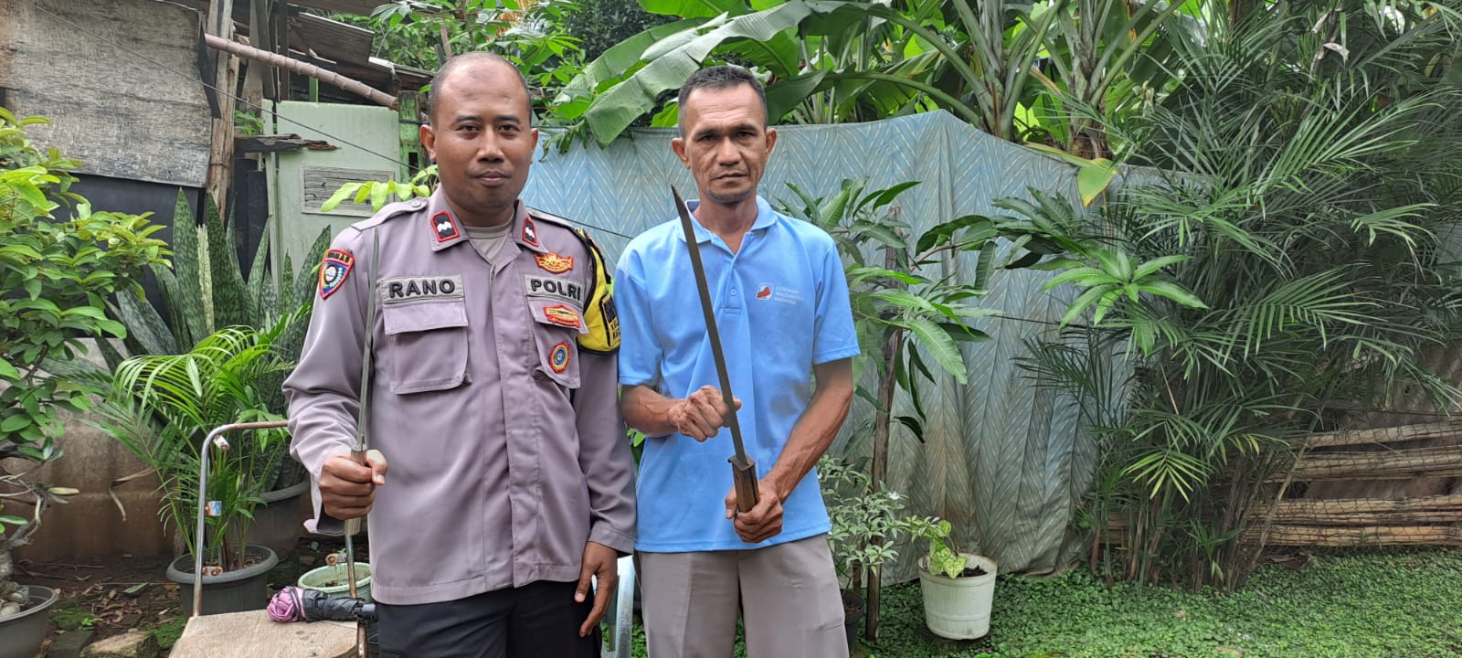 Klikbangsa.com (Kota Bekasi) – Sebuah langkah positif dalam menjaga keamanan dan ketertiban masyarakat (harkamtibmas) terwujud di Kelurahan Jatimekar, Kecamatan Jatiasih. Pada hari Senin, 3 Januari 2025, pukul 14.00 WIB, Bapak Timin, selaku Ketua RT 05/03 Kelurahan Jatimekar, menyerahkan dua buah pedang kepada Bhabinkamtibmas Jatimekar, Aipda Rano. Pedang tersebut ditemukan warga di sebuah kebun kosong dan diduga akan digunakan untuk aksi tawuran.Aipda Rano . “Kami sangat mengapresiasi tindakan Bapak Timin dan warga Jatimekar yang telah proaktif mendukung himbauan kamtibmas. Penyerahan dua pedang ini merupakan langkah konkret dalam mencegah potensi tawuran dan menjaga keamanan lingkungan. Kami berharap kerjasama yang baik ini dapat terus berlanjut demi terciptanya situasi kamtibmas yang kondusif di wilayah Jatimekar dan sekitarnya.” Ujarnya