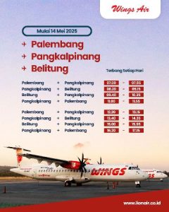 klikbangsa.com Palembang, 30 April 2025 – Maskapai penerbangan Wings Air mengumumkan pembukaan layanan penerbangan reguler yang menghubungkan tiga destinasi favorit di wilayah Sumatera Bagian Selatan. Rute baru ini akan melayani penerbangan harian antara Palembang, Pangkalpinang, dan Tanjung Pandan mulai 14 Mei 2025, dengan dua jadwal penerbangan setiap harinya — pagi dan siang.